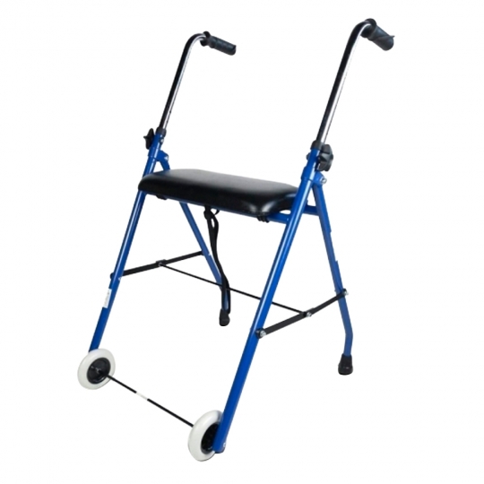Andarilho de 2 rodas, em aço e com assento almofadado.
