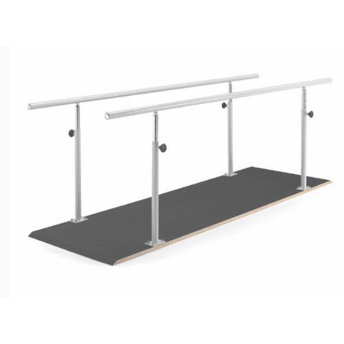 Barras paralelas com estrutura em aço com acabamento epoxy e base em madeira faia revestida a tela antiderrapante.