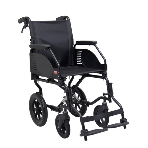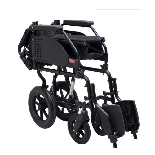Cadeira de trânsito leve, em alumínio. Com travão para o acompanhante. Encosto desmontável (fácil de transportar).