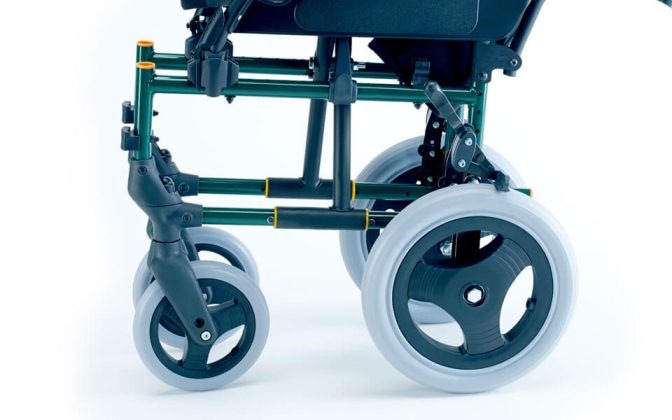 Disponível com roda traseira grande de 24”(para autopropulsão), maciça ou pneumática e roda traseira pequena de 12” (versão trânsito) maciça.