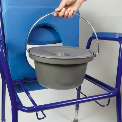 Cadeira sanitária robusta, com tampo almofadado, que pode ser utilizada como cadeira de descanso.