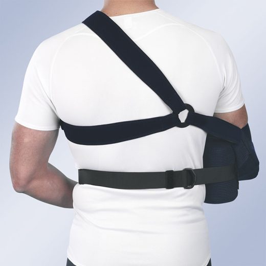 Imobilizador de ombro com abdução (30º a 45º), feito em tecido respirável (veludo POROMAX), que evita a transpiração excessiva e previne irritação da pele.